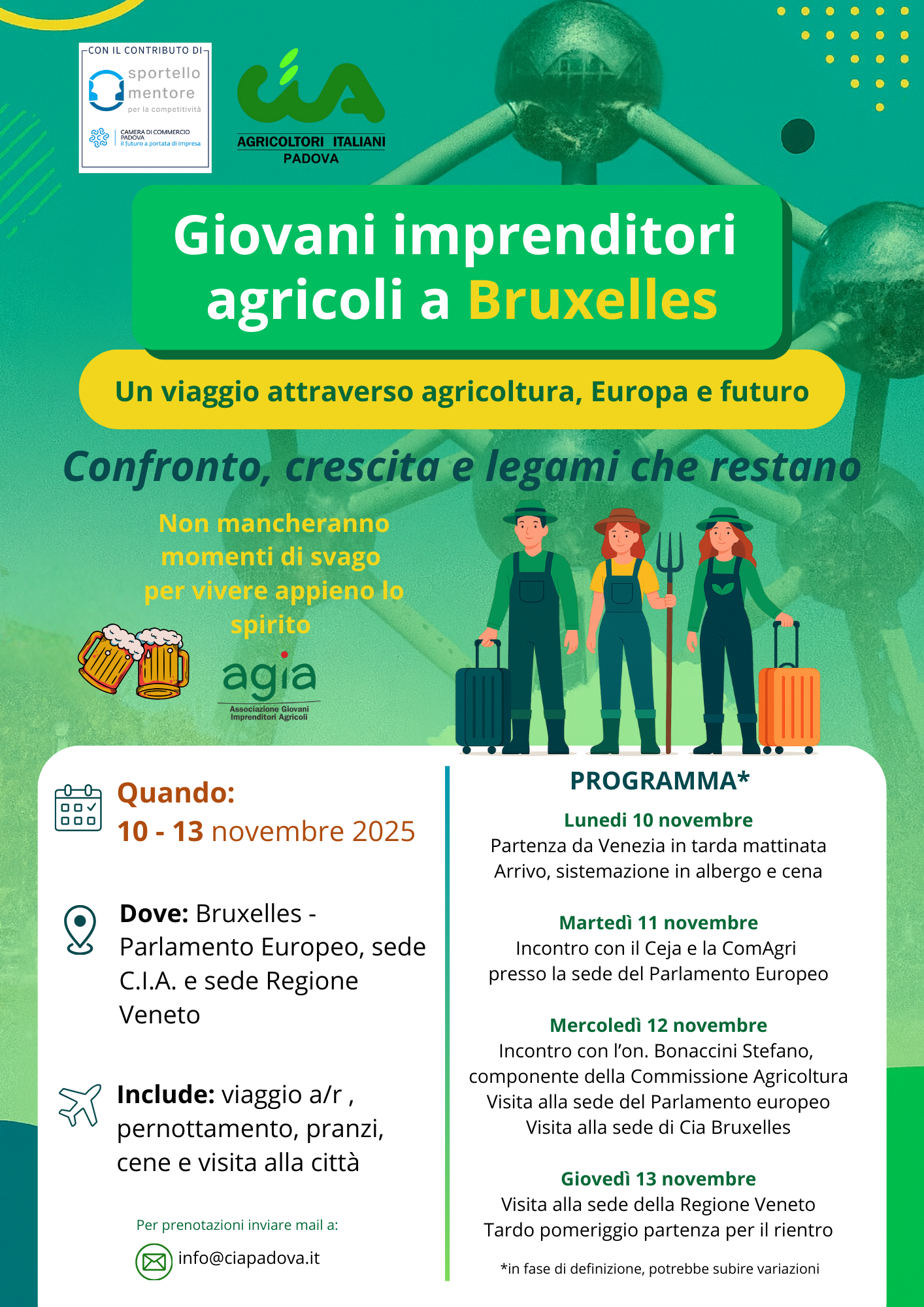 Organizzata da CIA Padova in collaborazione con la Camera di Commercio di Padova nell'ambito del Progetto Mentore, questa iniziativa offre un'immersione nel cuore delle politiche europee. I partecipanti avranno la possibilità di confrontarsi con le istituzioni e di approfondire i temi chiave per il futuro dell'agricoltura.