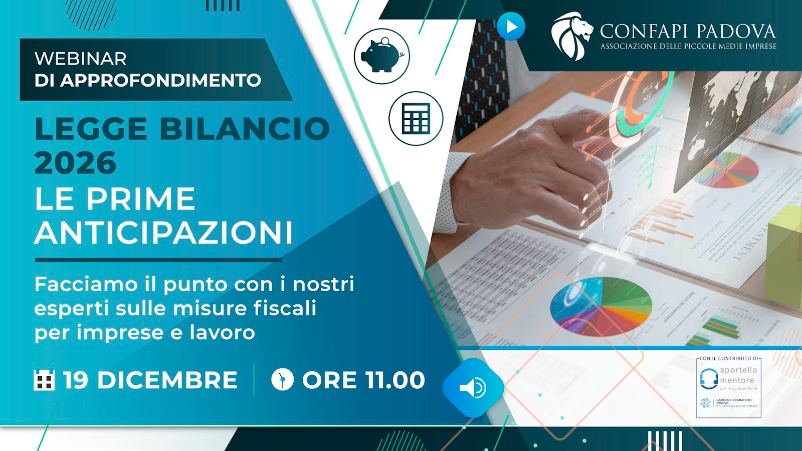 Il webinar offrirà agli imprenditori una prima panoramica delle principali misure previste nella futura Legge di Bilancio 2026, con un focus sulle novità fiscali e sugli incentivi destinati alle imprese.
