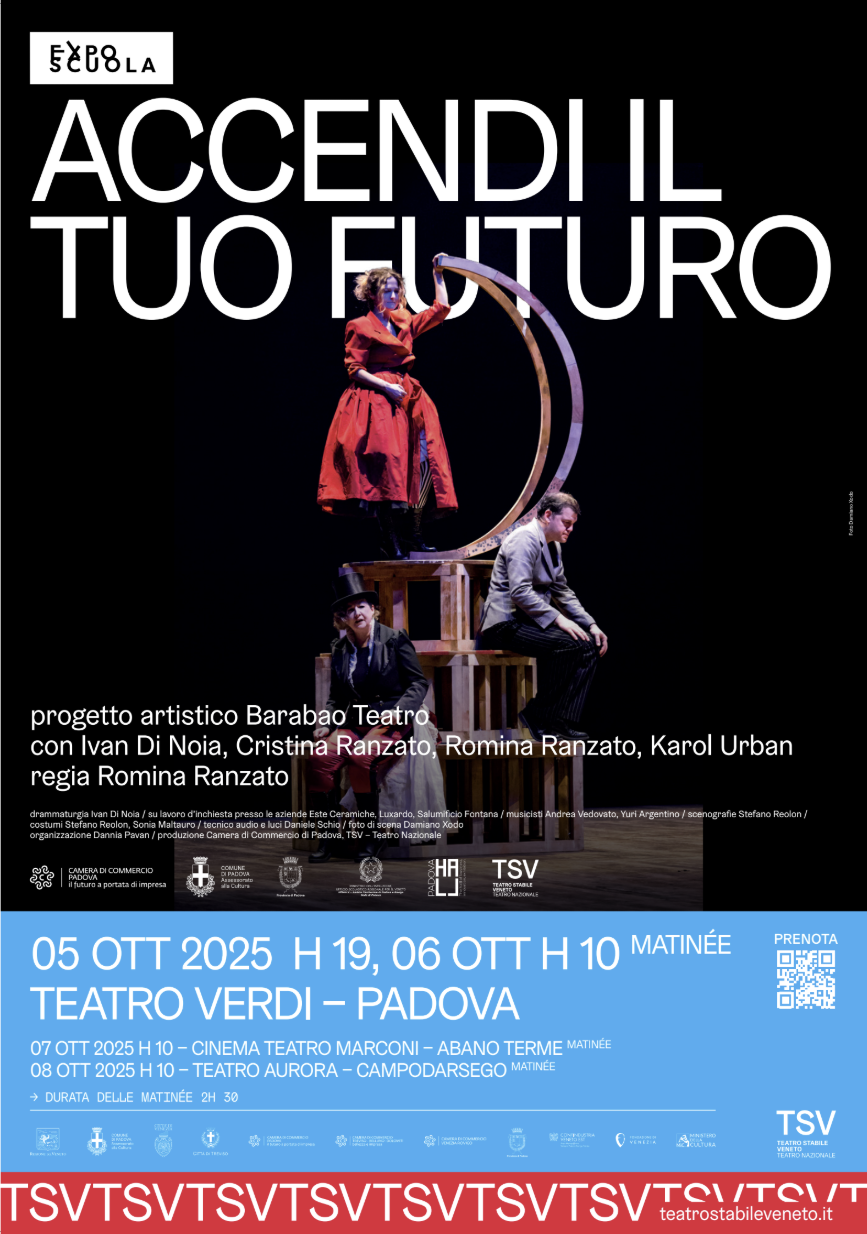 La Camera di Commercio di Padova e il Teatro Stabile del Veneto (TSV) presentano "Accendi il tuo futuro", un progetto artistico di Barabao Teatro. L'obiettivo è supportare i giovani nella scelta del proprio percorso professionale, mettendo in luce le diverse opportunità offerte dal mondo del lavoro e le competenze necessarie per affrontarlo.