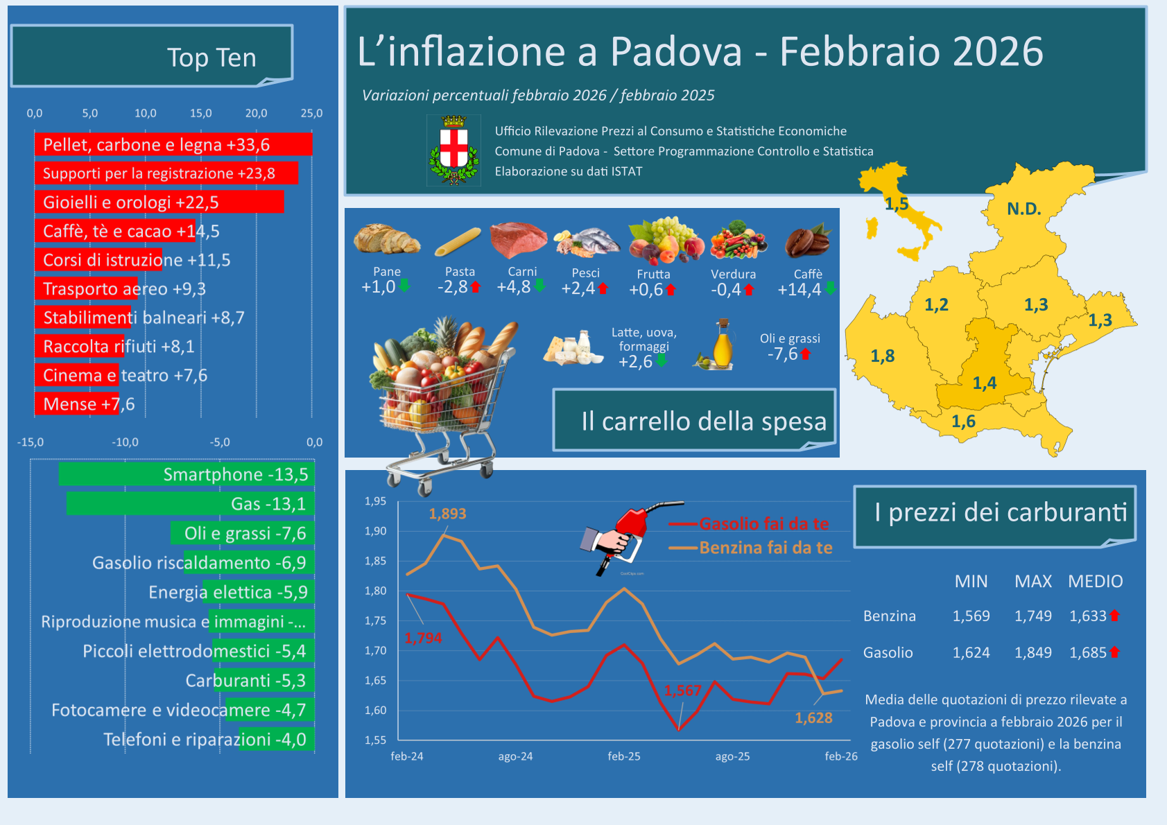 L'inflazione di febbraio 2026 riferita alla città di Padova: